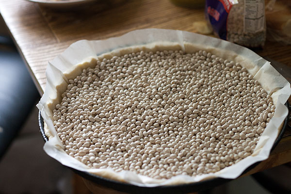 Сверху на тесто положить пекарскую бумагу, прижать ее к тесту, а на бумагу высыпать фасоль. Бумагу я обрезала для красоты.