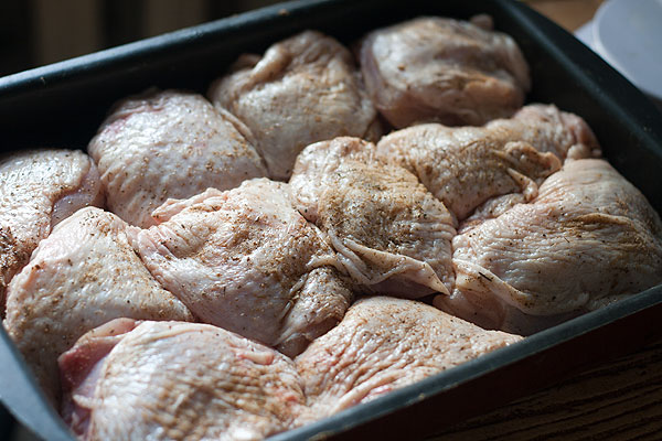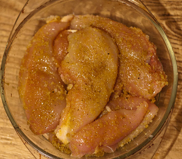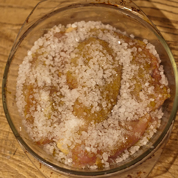 В посудину посыпать крупной морской соли. Натереть куриные грудки смесью из соли и специй, положить на соль (соль будет вытягивать из мяса жидкость).