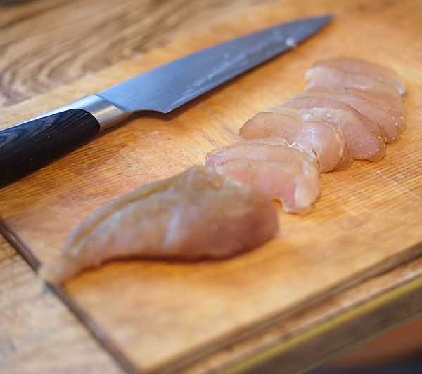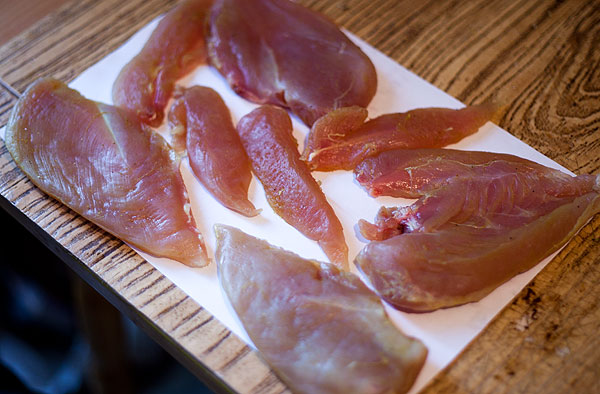 Взять куриную грудку, оторвать кожу и кости. Можно выкинуть, можно в другие нужды использовать. Здесь почти килограмм.