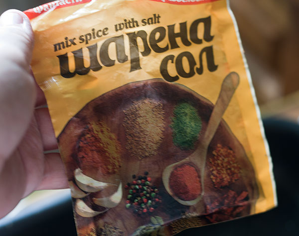 Когда женщина после работы приходит домой еле волоча ноги, вполне не стыдно сделать на ужин что-то простенькое. Ну, например, помазать куриные окорочка (бедра, голени) какой-нибудь готовой смесью ("острая соль", "вегетта", бульонный кубик, просто смешать соль и смесь приправ в произвольной пропорции). У меня вот такая (замечательная Полина привезла сувенир из Болгарии).