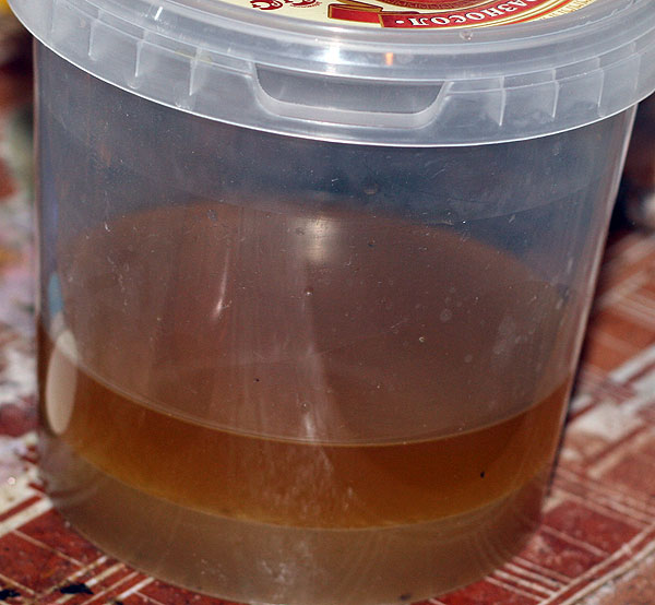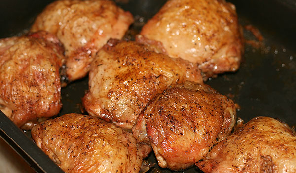 В духовку где-то на час-полтора, до красивой корочки. Изредка можно в духовку заглядывать. Выливать из противня излишки жидкости, которая там образуется. Парой ложек жидкости поливать куриные ноги сверху – корочка будет в итоге красивее. Но можно просто в духовке забыть на некоторое время. Вот вытопленная из куриных ног жидкость, она у меня в другую готовку пойдет.