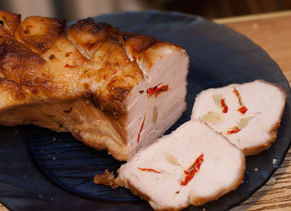 А внутри она розовая и очень нежная. Курица намного мягче говядины выходит. Нарезать чем тоньше, тем вкуснее.
