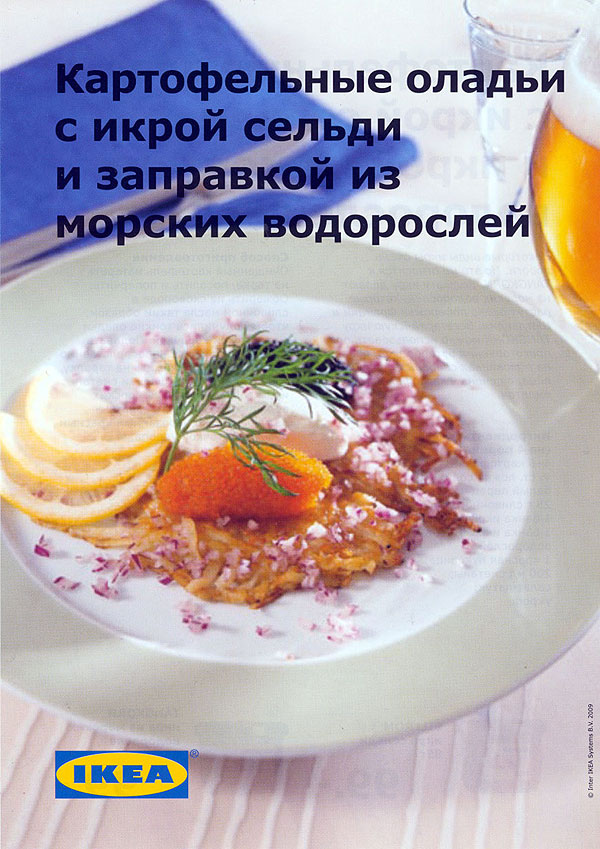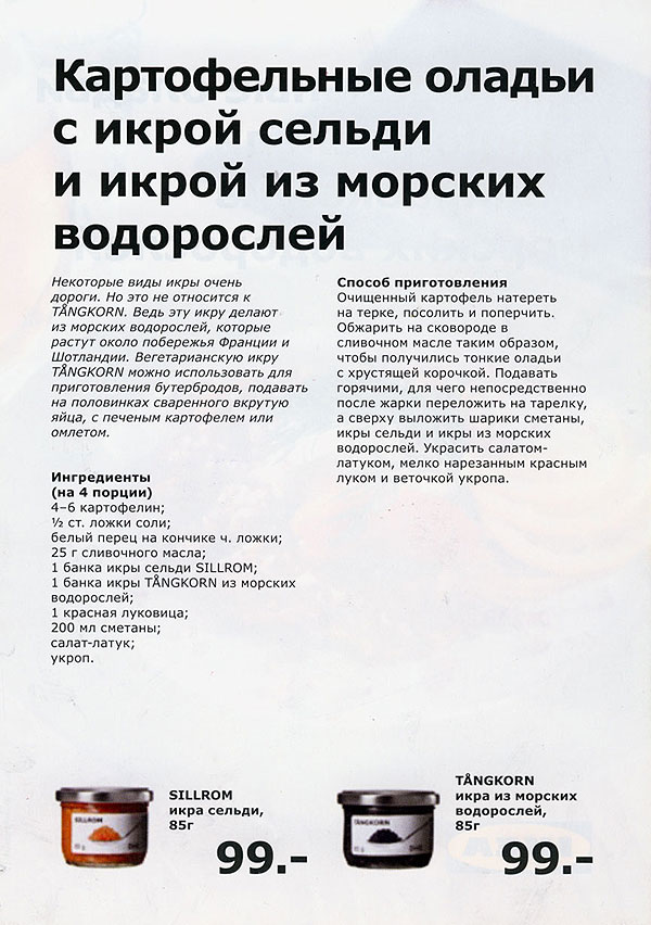 По икейскому совету я попробовала драники приправить икрой из морских водорослей. Ну, так. По-моему, лучше икру отдельно, а драники отдельно, если честно. А вот сами по себе драники – очень стоящая вещь!