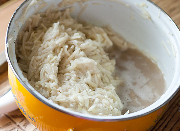 К сожалению, картошка всегда дает сок, который все портит. Я с соком борюсь так. Под одну сторону кастрюльки подкладываю нож, спичечный коробок и т.д. Тесто двигаю наверх, а жидкость сама сливается вниз.