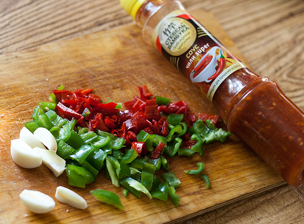 Тем временем порезать несколько острых перчиков (у меня 3 красных, 1 мясистый зеленый), пару зубчиков чеснока.