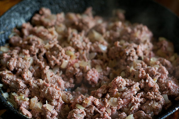 Добавить к луковице фарш. Пусть обжариваются вместе. Периодически помешивать. До изменения цвета фарша.
