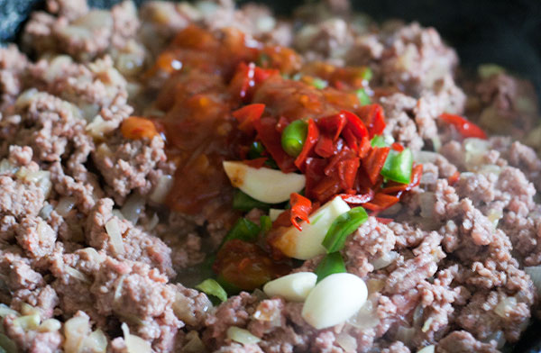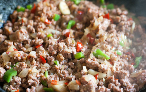 Пару минут обжаривать фарш с соусом и перчиками, чтобы вкусы перемешались, а лишняя жидкость от соуса выпарилась. Чеснок должен с легкостью разламываться лопаткой.