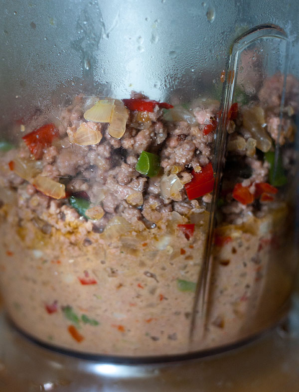 Обжаренный фарш в блендер или в мясорубку. На фото: сверху в блендере – консистенция просто жареного фарша, снижу – дополнительно перемолотого. Очень нежная консистенция пюре должна получиться. В принципе, этот этап можно пропустить, но я очень не рекомендую.