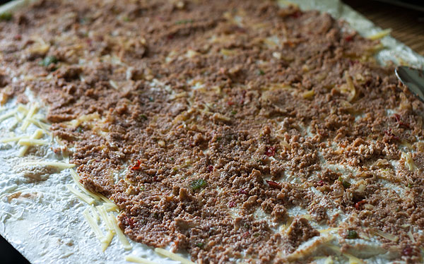 Лаваш расстелить на столе. Всю поверхность лаваша смазать сметаной. Около 2 ст.л. на лист у меня ушло. Сверху присыпать без фанатизма тертым сыром. Сверху смазать мясным фаршем. (Половиной всей массы, у нас же 2 лаваша). Слой мясного фарша нельзя делать тонким – будет невкусно. Но нельзя и слишком толстым, опять же будет не очень. Примерно слой фарша по толщине как лаваш или чуть толще. От края лаваша чуть отступила, чтобы фарш не вывалился ненароком.