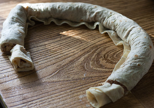 Скатать лаваш рулетом вдоль длинной стороны (длина рулета чуть больше 80 см у меня). Концы рулета я обкромсала, потому что на концах, как мне показалось, маловато фарша. Это, кстати, можно съесть – это уже вкусно )))