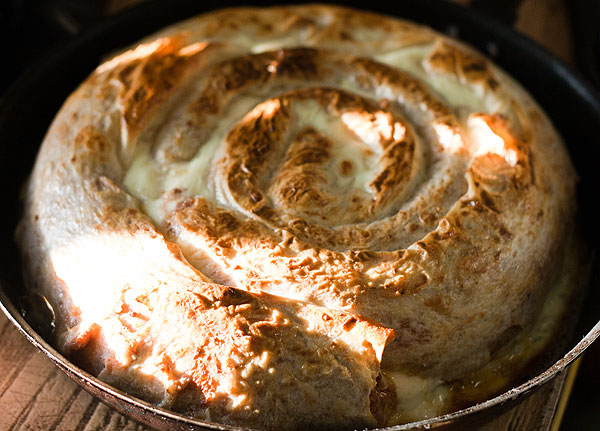 Аналогично поступить со вторым лавашом и с остатками сметаны, сыра, фарша. Два рулета свернуть улиткой в форме. У меня случился прокол: маленькая форма оказалась для двух рулетов мала, а большая сковородка уже велика (как видно из фото). В следующий раз буду делать такое же из 3 лавашей ))) 2 свернутых улиткой рулета полить поливкой (которую мы делали в пункте 5).