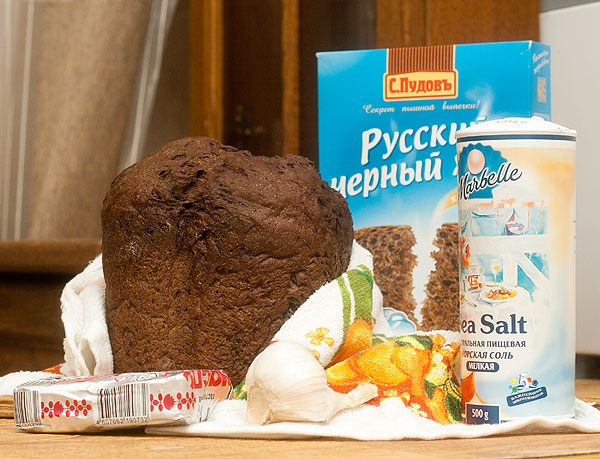 Пошаговых фоток нафоткала штук 10 (для процесса приготовления гренок, ага). А как гренки приготовила, отвернулась ненадолго. Поворачиваюсь, а гренок-то и нет! Схомячили все мои домашние. Вобщем, чесночные гренки из Русского черного хлеба от С.Пудов (на фото и сам хлеб, уже испеченный, и пачка от него) вышли неимоверно прекрасные. Но в конкурсе участвовать эти гренки не будут.
