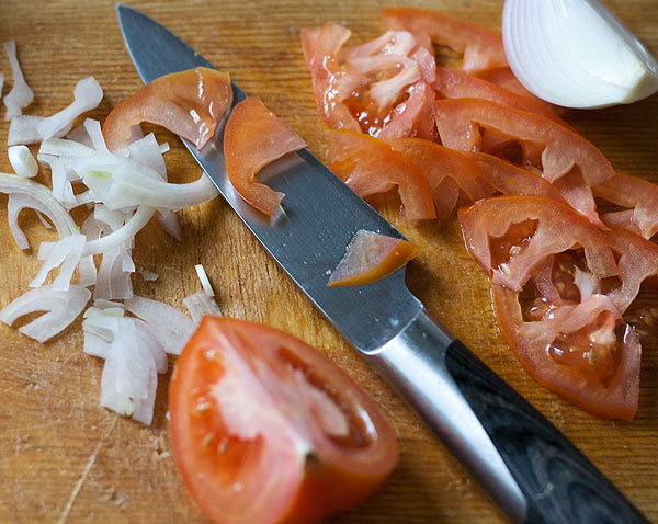 Помидоры и лук порезать кольцами. По количеству помидор примерно в 3-4 раза больше, чем луковиц.