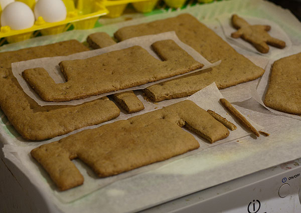 Теста хватило тютелька-в-тютельку. Осталось только на 5 человечков. Оставить печенье остывать. Кстати, сразу после духовки коржи мягкие, но довольно быстро твердеют. Пока они мягкие, их можно подрезать, если надо. В духовке тесто поднимается раза в полтора, поэтому чуть-чуть подрезала. На икейских формах есть рельеф. Например, крыша должна получиться будто бы с черепицей, на стенах должны быть контуры окон и двери – это тесто не позволило им проявиться. Не знаю, хоть какое-то тесто позволило бы.