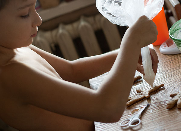 Остывшее печенье и детали домика украшаем. Украшают, конечно, пацаны.