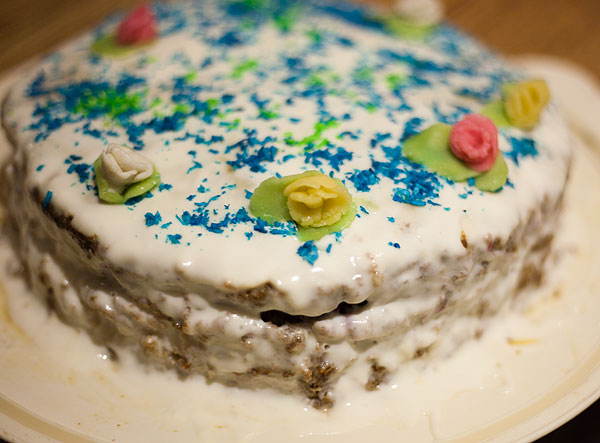 Сначала часа на 2-3 храним в холодильнике. Потом украшаем. Украшаем так: хорошо смазываем кремом со всех сторон (на фото торт почти готов, только бока не промазаны – промазывала бока и верх до равномерно белого цвета). Поверх можно присыпать цветной кокосовой стружкой, кондитерской посыпкой и т.д. Мы назвали торт “Лилии в пруду”.