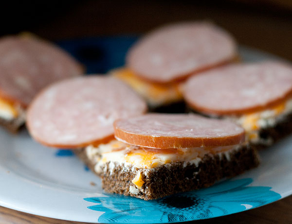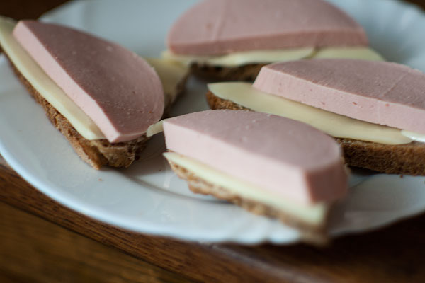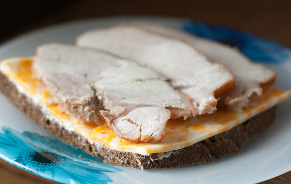 Или так. Снова традиционный бутерброд хлеб-масло-сыр-колбаса.