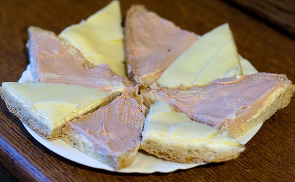Не уверена, что бутерброды на фотографии с этим хлебом, но такие бутерброды будут вкусные. Здесь бутерброды с сыром и бутеброды с печеночным паштетом (кто не приемлет покупной, может сделать сам).