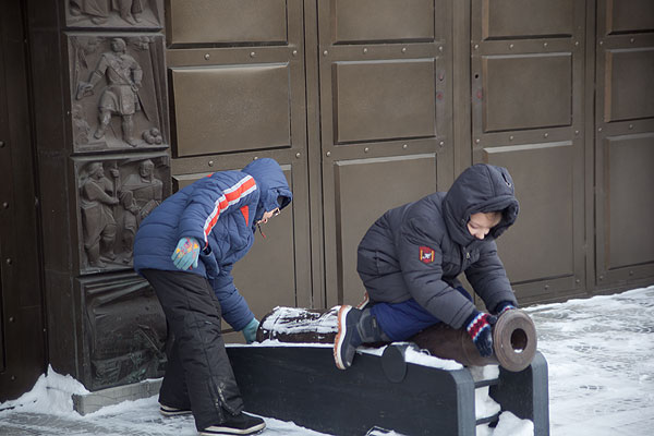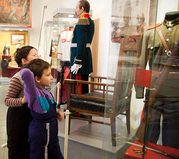 В этом же зале казачье оружие, книги, манекены в казачьей форме. Хотя мальчишкам и пушка с ядрами интересна, и шашки, но макеты привлекли основное внимание.