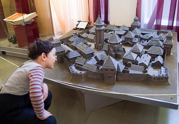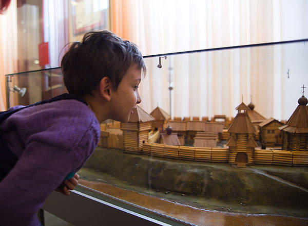 Антон смотрит на макет Тарской крепости. (Тара – город в Омской области, второй по величине. Основан примерно на 120 лет раньше Омска, первое русское поселение на территории современной Омской области.)
