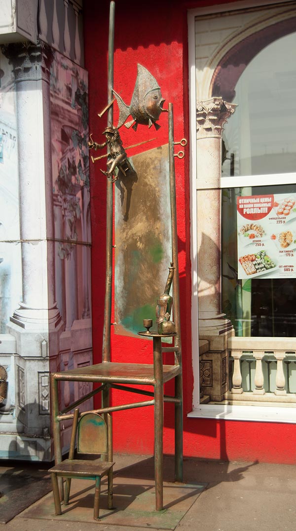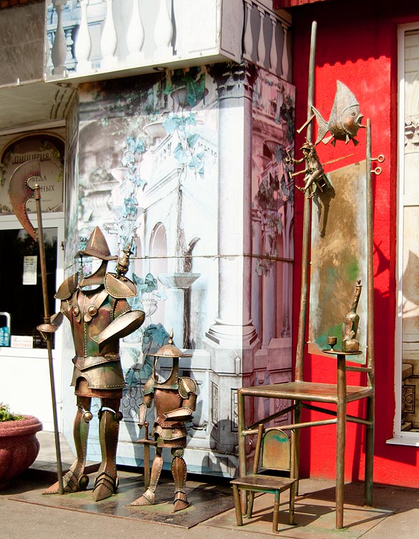 Александр Капралов постоянно сотрудничает с сетью ресторанов Контанелло, Бевиторе, Дали. В этой Контанелле я еще не была, она мне совсем не по пути. Поэтому этих конкретных рыцарей пока не показывала, хотя они в Омске уже давно.На крылечке 2 скульптуры: рыцари и трон.