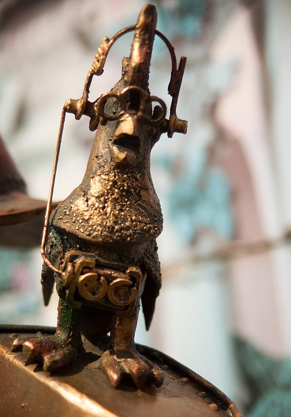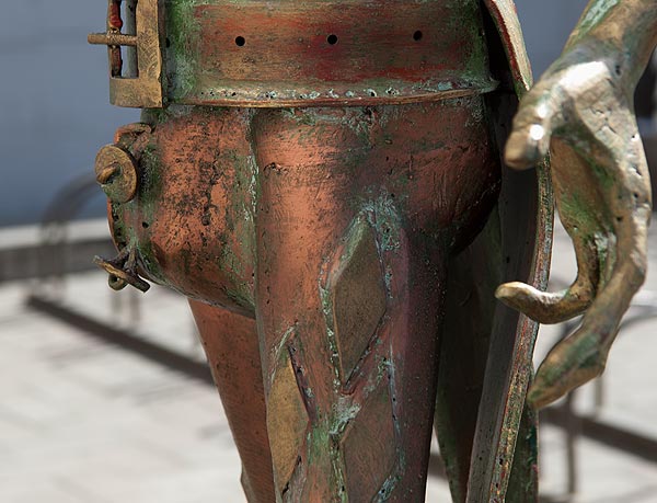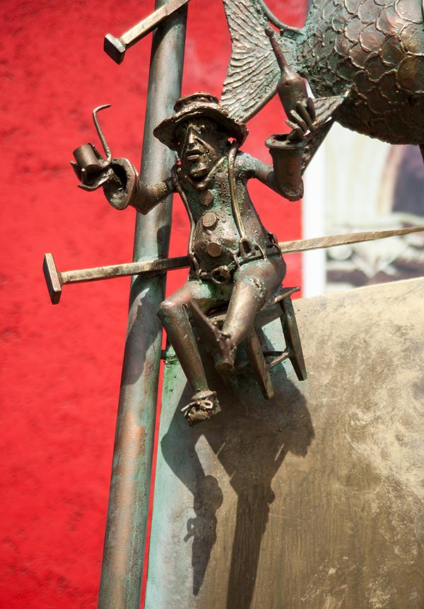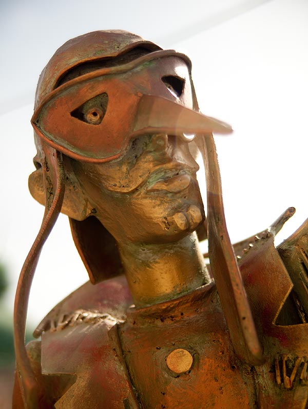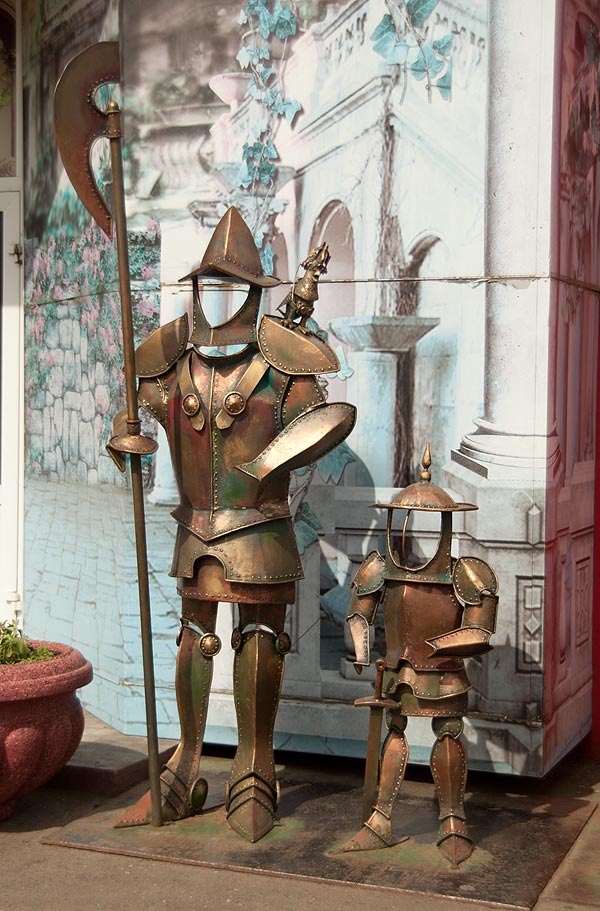 Кто-то смутно помнит, что я уже показывала каких-то рыцарей для фотографирования. Это были другие, возле другого ресторана Контанелло. Это меня тоже очень радует, что скульптуры совсем разные. Эти рыцари сложнее. Например, мужа абсолютно подкупил попугай в очках из кастета.