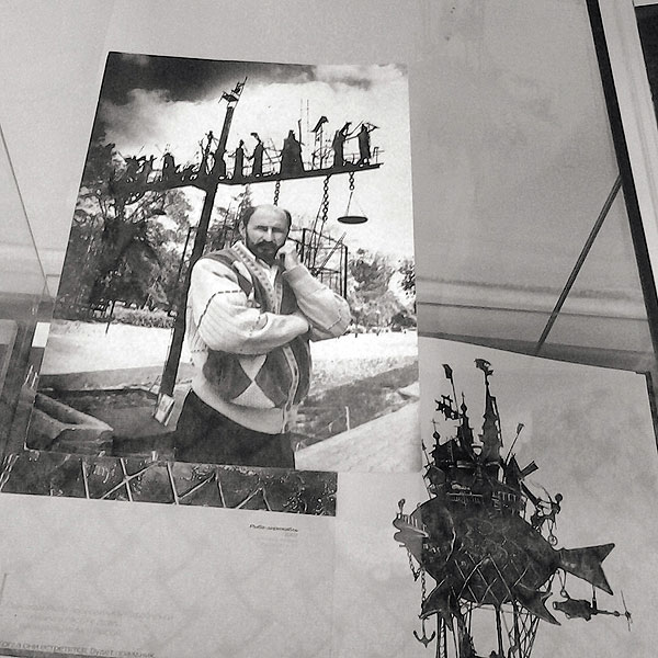На переднем плане – фотография автора со скульптурой Весы. На нижней полочке разворот книги с фотографией Коммунального карася.