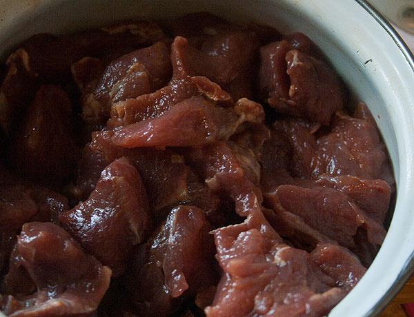 Так вот, тушеная говядина будет изумительно вкусная, если до этого ее на 2 дня замариновать в волшебном маринаде. Для маринада я использую капельку растительного масла, 2 ложки соевого соуса, немного крепкого алкоголя (у меня – ром), ложку сахара и что-нибудь остренькое (либо несколько капель соуса Табаско, либо кайенский молотый перец).
