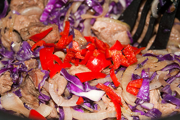 Тушеная говядина получается просто изумительно вкусная (можно тушить с капустой и острым перцем – как показано на картинке выше, а можно с картошкой, а можно и с любым другим набором овощей или вовсе без них).