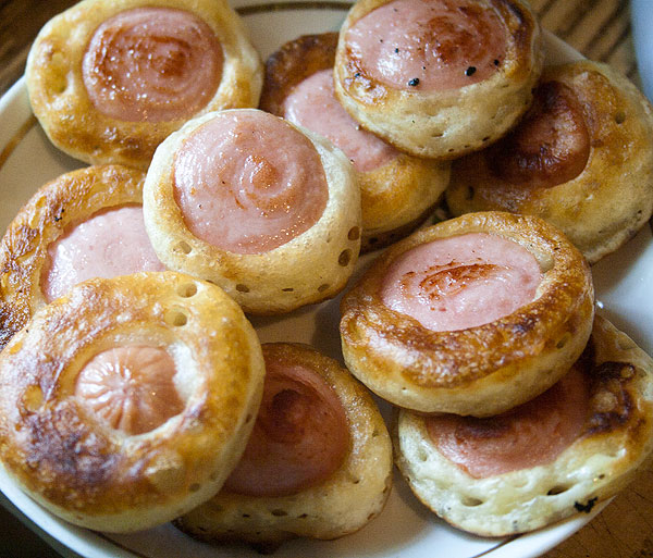 Все, готовые смеси закончились на сегодня. Зато вот еще детское блюдо -- оладушки Для Дениса, когда нет под рукой пирожкового теста, можно сделать олад-сосиски.