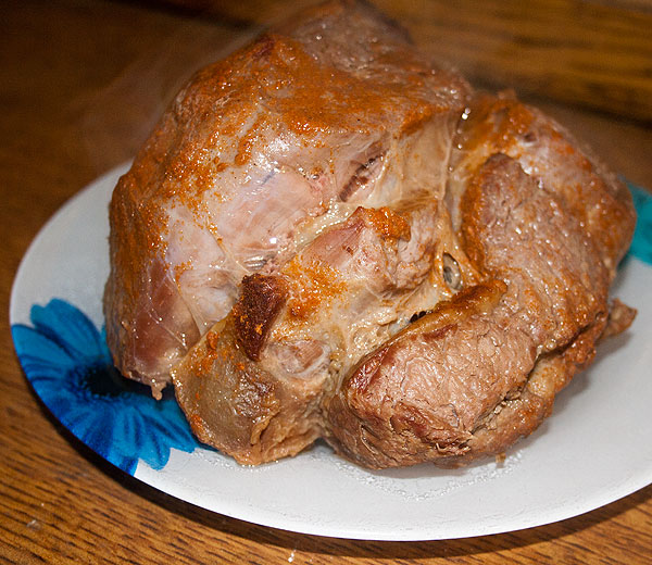 Какое мясо? Мясо нужно хорошее. )) А вот свинина или говядина – не так важно. На этих фотографиях у меня говядина, хотя сто раз так же готовила и свинину. Можно брать шею или окорок. Здесь – тазовая часть говядины, если не ошибаюсь. От свинины точно так же готовила лопатку. Короче, любую часть, которая вам понравится. Не обязательно идеальный кусок брать. Вон у меня какой-то кусок жира непонятный, который, конечно, есть никто не будет. Можно так готовить и грудку (как куриную, так и индейкину).