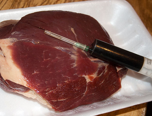 Ну, вот. Поставили соевые уколы, мясо соусом напиталось, в объеме больше стало. Сколько мяса влезет, столько и колите. Хуже не будет. Если часть соуса из мяса вылилась, его можно собрать и обратно вколоть.