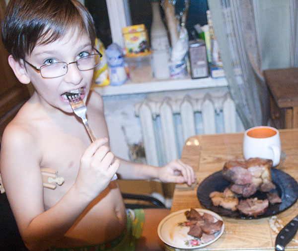 (На фото с Антоном именно тот кусок, что на пошаговых фотографиях приготовления. На фото готового мяса куском – тот же рецепт, но в другой день).