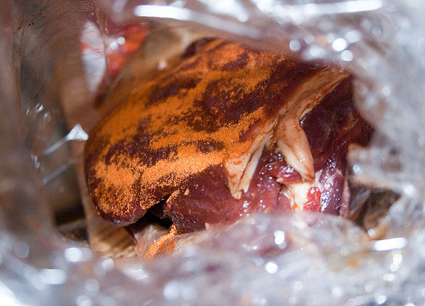 Нашпигованное мясо обмазываем специями. Можно обмазать кетчупом (или другим соусом). Можно обмазать сухой горчицей. Я в последнее время всегда мажу вот таким кайенским перцем:
