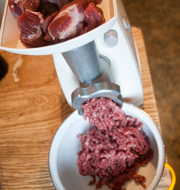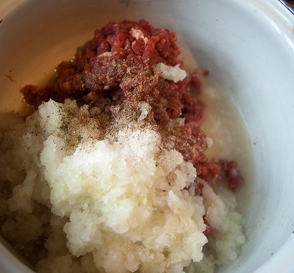 Следом за мясом пропустить через мясорубку лук. Лука по объему половина или даже чуть больше мяса. Соль, перец по вкусу. (Обычно чайная ложка соли без верха на полкило мяса, перца в 2-3 раза меньше)