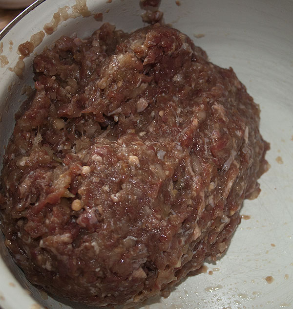 Хорошенько перемешать. Когда мололи, из лука выдавился сок. А когда перемешивали фарш, этот сок обратно вмешался в начинку.