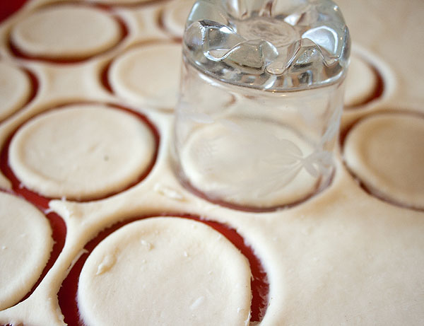 От теста отрываем небольшой кусок, раскатываем его тонко, как только можем. Бабушка в детстве учила меня, что тесто для пельменей должно просвечивать. Водочной рюмкой вырезаем кругляшки.