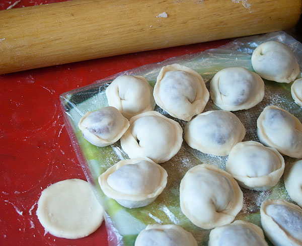 Лепим-лепим. То, что хотим оставить впрок, раскладываем на подносе и замораживаем в морозилке (или зимой на балконе). То, что хотим есть сразу, варим сразу. Кто не знает, что делать с налепленными пельменями – был спец.пост “10 способов приготовить пельмени”