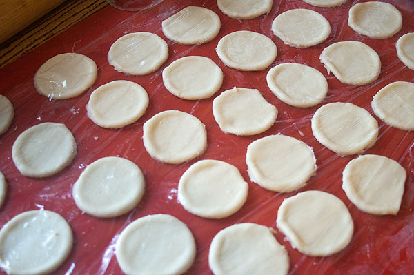 Тесто между кругляшками убрать обратно в пакет. Кругляшки я прикрываю пленкой, чтобы не подсыхали. Но тогда они иногда могут наоборот стать сильно липкими. Самое оптимальное – не вырезать много кругляшков сразу.