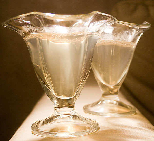 Сюда добавить примерно 3/4 – 1 стакан сахара. Хорошенько размешать до полного растворения сахара, снять с огня. Влить в кастрюлю бутылку (0,75 литра) брюта. Мне кажется, что брют можно брать любой, даже не сильно дорогой. У меня был Российский. Хорошо размешать. Залить в лоток. Я половину разлила по креманкам (5 порций по 100 грамм). А половину налила в лоток. Поставить желе в холодильник застывать. На 7-8 часов можно про желе забыть. И вообще, следующие приготовления уже перед самой подачей на стол.
