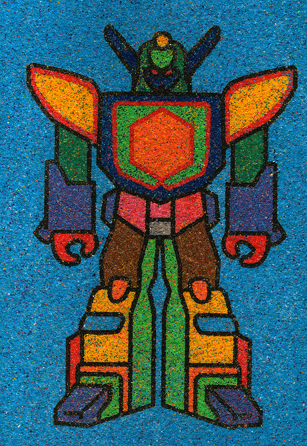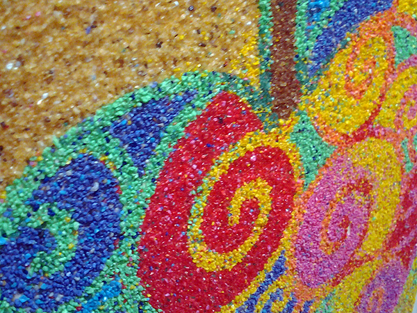 Технология очень простая. Есть клейкая основа. Сначала она оклеена бумагой. Бумага уже разрезана по шаблону. Снимаешь кусок бумаги, посыпаешь открывшийся липкий кусок цветным песком. Песок прилипает. Снимаешь другой кусок бумаги и т.д.