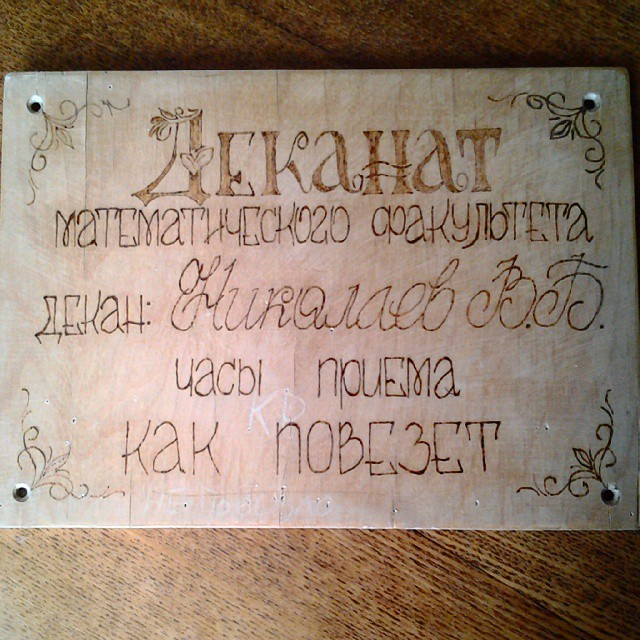 Ну, и пятая -- самая позитивная картинка. Нашла в деканате старую табличку. Табличку сделали студенты матфака 97 года (на Днях математики). Маша Шмидт и Рома Васецкий. Табличка долго висела на двери деканата. В частности, всю мою студенческую жизнь. По слухам, еще 3 года назад висела. Почему ее сняли -- не знаю. Но табличка очень классная. И правильная.