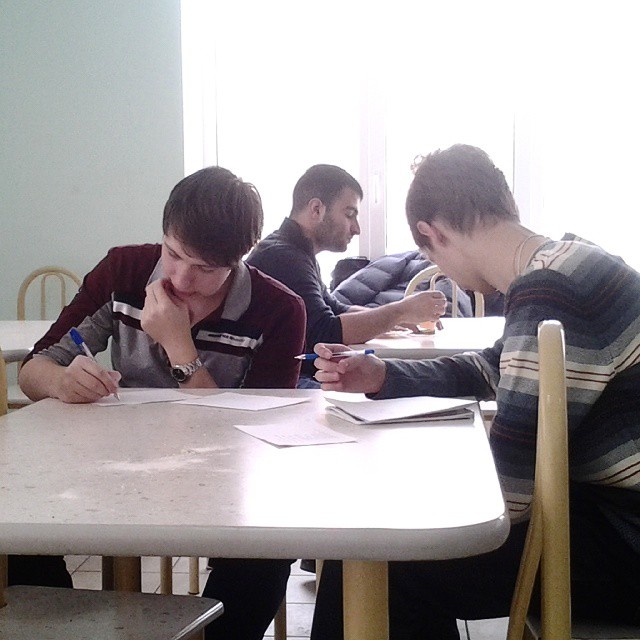 Картинка номер два. Пересдача. В виду того, что в универе бардак, пересдачу я провожу в буфете. В актовом зале ремонт уже больше года. Еще в двух аудиториях ремонт на каникулах начали, но пока не закончили -- хотя занятия туда поставили. Преподаватели ведут занятия в самых неожиданных местах. Я вот в буфете ))) Вот студенты и расслабились ))