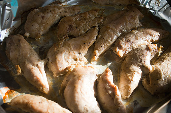 Мед или кленовый сироп смешать с горчицей (в соотновении 1:3), обмазать этим грудки курицы. На лист положить кусок фольги, чтобы потом не отмывать лист.