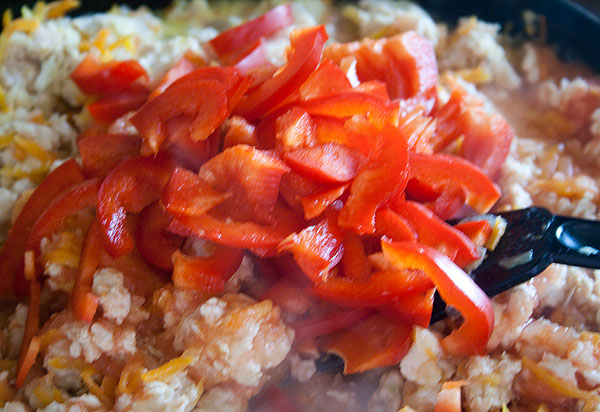 Туда же добавляем перец. Добавляем соль и специи. Если среди перца не было перца чили, то можно поперчить посильнее.