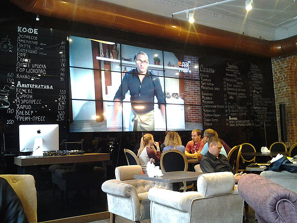 Вобщем, интерьер чудесный. Единственный неоднозначный элемент – телевизор во всю стену. Я уже писала, что, кроме как в спорт-барах, телевизоры не люблю и не понимаю. Мне нравится за обедом беседовать. Плюс в том, что телевизоров всего два (в одном зале, и в другом зале) и запросто можно сесть к нему спиной.