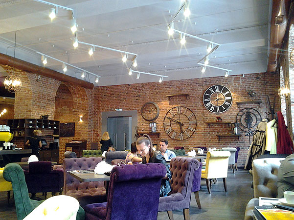Все столики с мягкими креслами. Кресла разномастные и разноцветные. Мягкие и удобные. Кстати, есть с кресла намного удобнее, чем с дивана – ведь вы можете кресло придвинуть к столику на столько, на сколько надо. Эти же кресла, как выяснилось, отлично зонируют пространство. И даже когда сидишь в центре зала, не чувствуется, что сидишь в проходе.