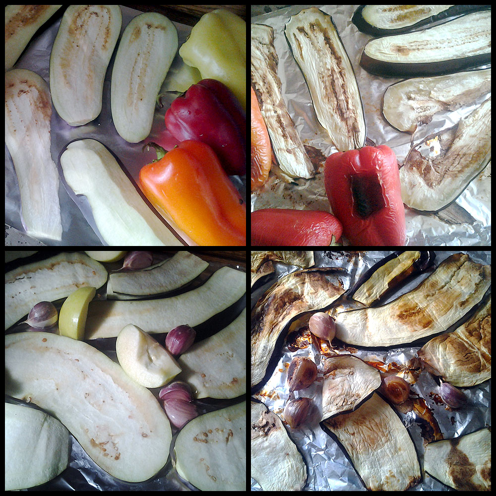 Баклажаны (у меня 2 больших, но не слишком толстых) разрезаем вдоль на ломтики толщиной около полусантиметра. Тоньше не надо – они засохнут в духовке. Лучше даже потолще. На лист раскладываем фольгу. На 1 лист у меня влез 1 баклажан и болгарские перцы (4 штуки). Болгарские перцы прямо целиком, чистить не надо. На второй лист точно так же 1 баклажан, неочищенные дольки чеснока (1 головка), 1 небольшое яблоко, разрезанное четвертинками.