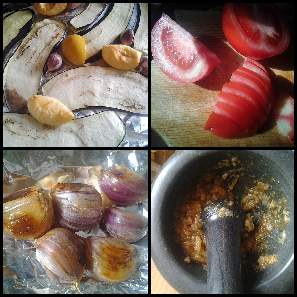 Все соединяем: баклажаны, перцы, яблоко, помидоры, чесночную заправку. Можно подавать еще теплым (тога помидорки лучше порезать заранее, чтобы остальные овощи не успели остыть). Можно и холодным. Можно как гарнир, а можно как салат.