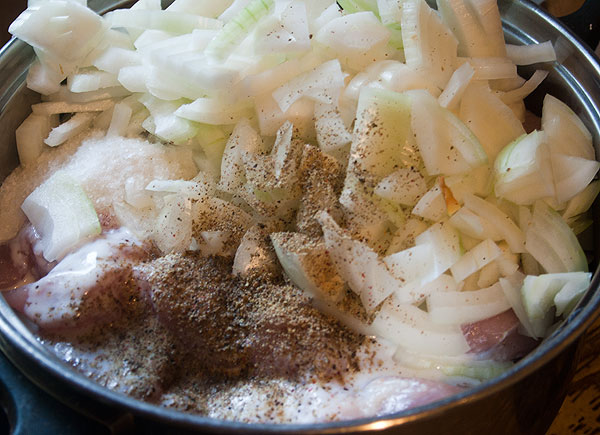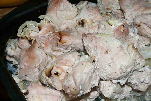 Я замариновала грудку в луке и кефире (на 1,5 кг грудки индейки взяла полкило лука, порезанного полукольцами и стакан кефира, ну, и соль-перец). Потом выехать на шашлыки не получилось, поэтому готовила просто в духовке. В виде шашлыков она была бы изумительная. Ну, а так – просто нормальная, хоть на фото и не очень красивая))))